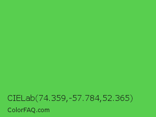 CIELab 74.359,-57.784,52.365 Color is a normal green color and the nearest color is Mantis #74c365. Hex code #58cf4f and RGB value is rgb(88,207,79). In RGB color space, this color is composed of 35% red, 81% green, 31% blue, In CMYK color space, this color is composed of 57% cyan, 0% magenta, 62% yellow , 19% black , In HSL color space, this color has a hue angle of 116° , 57% saturation and 56% lightness.