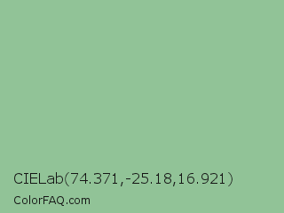CIELab 74.371,-25.18,16.921 Color is a light green color and the nearest color is Dark Sea Green #8fbc8f. Hex code #91c397 and RGB value is rgb(145,195,151). In RGB color space, this color is composed of 57% red, 76% green, 59% blue, In CMYK color space, this color is composed of 26% cyan, 0% magenta, 23% yellow , 24% black , In HSL color space, this color has a hue angle of 127° , 29% saturation and 67% lightness.