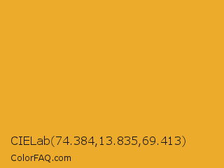 CIELab 74.384,13.835,69.413 Color is a normal orange color and the nearest color is Fuel Yellow #eca927. Hex code #edab2b and RGB value is rgb(237,171,43). In RGB color space, this color is composed of 93% red, 67% green, 17% blue, In CMYK color space, this color is composed of 0% cyan, 28% magenta, 82% yellow , 7% black , In HSL color space, this color has a hue angle of 40° , 84% saturation and 55% lightness.