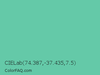 CIELab 74.387,-37.435,7.5 Color is a normal green color and the nearest color is Medium Aquamarine #66ddaa. Hex code #64c9a8 and RGB value is rgb(100,201,168). In RGB color space, this color is composed of 39% red, 79% green, 66% blue, In CMYK color space, this color is composed of 50% cyan, 0% magenta, 16% yellow , 21% black , In HSL color space, this color has a hue angle of 160° , 48% saturation and 59% lightness.