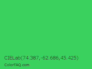 CIELab 74.387,-62.686,45.425 Color is a normal green color and the nearest color is UFO Green #3cd070. Hex code #3ad15e and RGB value is rgb(58,209,94). In RGB color space, this color is composed of 23% red, 82% green, 37% blue, In CMYK color space, this color is composed of 72% cyan, 0% magenta, 55% yellow , 18% black , In HSL color space, this color has a hue angle of 134° , 62% saturation and 52% lightness.