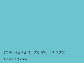 CIELab 74.3,-23.53,-13.722 Color is a light cyan color and the nearest color is Downy #6fd0c5. Hex code #6cc4cf and RGB value is rgb(108,196,207). In RGB color space, this color is composed of 42% red, 77% green, 81% blue, In CMYK color space, this color is composed of 48% cyan, 5% magenta, 0% yellow , 19% black , In HSL color space, this color has a hue angle of 187° , 51% saturation and 62% lightness.