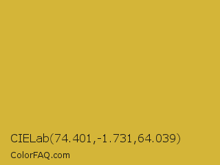 CIELab 74.401,-1.731,64.039 Color is a normal yellow color and the nearest color is Old Gold #cfb53b. Hex code #d4b538 and RGB value is rgb(212,181,56). In RGB color space, this color is composed of 83% red, 71% green, 22% blue, In CMYK color space, this color is composed of 0% cyan, 15% magenta, 74% yellow , 17% black , In HSL color space, this color has a hue angle of 48° , 64% saturation and 53% lightness.
