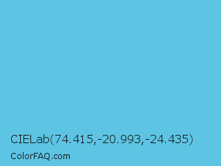 CIELab 74.415,-20.993,-24.435 Color is a light blue color and the nearest color is Viking #64ccdb. Hex code #5dc4e3 and RGB value is rgb(93,196,227). In RGB color space, this color is composed of 36% red, 77% green, 89% blue, In CMYK color space, this color is composed of 59% cyan, 14% magenta, 0% yellow , 11% black , In HSL color space, this color has a hue angle of 194° , 71% saturation and 63% lightness.