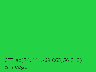 CIELab 74.441,-69.062,56.313 Color is a normal green color and the nearest color is Lime Green #32cd32. Hex code #24d345 and RGB value is rgb(36,211,69). In RGB color space, this color is composed of 14% red, 83% green, 27% blue, In CMYK color space, this color is composed of 83% cyan, 0% magenta, 67% yellow , 17% black , In HSL color space, this color has a hue angle of 131° , 71% saturation and 48% lightness.