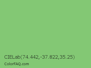 CIELab 74.442,-37.822,35.25 Color is a light green color and the nearest color is Pistachio #93c572. Hex code #83c874 and RGB value is rgb(131,200,116). In RGB color space, this color is composed of 51% red, 78% green, 45% blue, In CMYK color space, this color is composed of 35% cyan, 0% magenta, 42% yellow , 22% black , In HSL color space, this color has a hue angle of 109° , 43% saturation and 62% lightness.