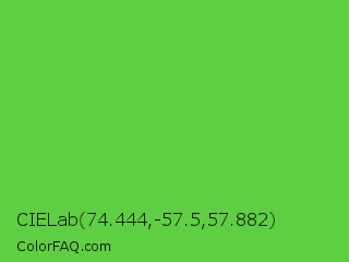 CIELab 74.444,-57.5,57.882 Color is a normal green color and the nearest color is Green RYB #66b032. Hex code #5ecf42 and RGB value is rgb(94,207,66). In RGB color space, this color is composed of 37% red, 81% green, 26% blue, In CMYK color space, this color is composed of 55% cyan, 0% magenta, 68% yellow , 19% black , In HSL color space, this color has a hue angle of 108° , 59% saturation and 54% lightness.