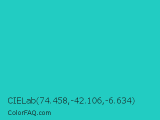 CIELab 74.458,-42.106,-6.634 Color is a normal cyan color and the nearest color is Java #1fc2c2. Hex code #22ccc2 and RGB value is rgb(34,204,194). In RGB color space, this color is composed of 13% red, 80% green, 76% blue, In CMYK color space, this color is composed of 83% cyan, 0% magenta, 5% yellow , 20% black , In HSL color space, this color has a hue angle of 176° , 71% saturation and 47% lightness.