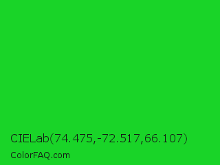 CIELab 74.475,-72.517,66.107 Color is a normal green color and the nearest color is Lime Green #32cd32. Hex code #19d428 and RGB value is rgb(25,212,40). In RGB color space, this color is composed of 10% red, 83% green, 16% blue, In CMYK color space, this color is composed of 88% cyan, 0% magenta, 81% yellow , 17% black , In HSL color space, this color has a hue angle of 125° , 79% saturation and 46% lightness.
