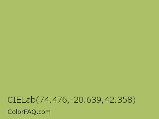 CIELab 74.476,-20.639,42.358 Color is a normal lime color and the nearest color is Middle Green Yellow #acbf60. Hex code #acc067 and RGB value is rgb(172,192,103). In RGB color space, this color is composed of 67% red, 75% green, 40% blue, In CMYK color space, this color is composed of 10% cyan, 0% magenta, 46% yellow , 25% black , In HSL color space, this color has a hue angle of 73° , 41% saturation and 58% lightness.