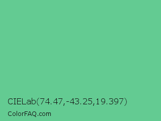 CIELab 74.47,-43.25,19.397 Color is a normal green color and the nearest color is Silver Tree #66b58f. Hex code #63cb92 and RGB value is rgb(99,203,146). In RGB color space, this color is composed of 39% red, 80% green, 57% blue, In CMYK color space, this color is composed of 51% cyan, 0% magenta, 28% yellow , 20% black , In HSL color space, this color has a hue angle of 147° , 50% saturation and 59% lightness.
