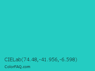 CIELab 74.48,-41.956,-6.598 Color is a normal cyan color and the nearest color is Java #1fc2c2. Hex code #24ccc2 and RGB value is rgb(36,204,194). In RGB color space, this color is composed of 14% red, 80% green, 76% blue, In CMYK color space, this color is composed of 82% cyan, 0% magenta, 5% yellow , 20% black , In HSL color space, this color has a hue angle of 176° , 70% saturation and 47% lightness.