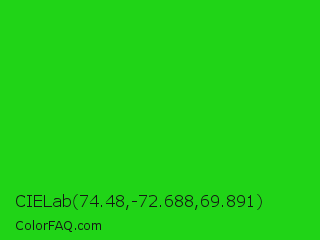 CIELab 74.48,-72.688,69.891 Color is a normal green color and the nearest color is Lime Green #32cd32. Hex code #20d417 and RGB value is rgb(32,212,23). In RGB color space, this color is composed of 13% red, 83% green, 9% blue, In CMYK color space, this color is composed of 85% cyan, 0% magenta, 89% yellow , 17% black , In HSL color space, this color has a hue angle of 117° , 80% saturation and 46% lightness.