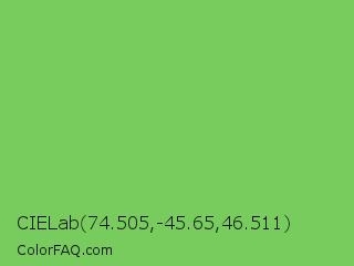 CIELab 74.505,-45.65,46.511 Color is a normal green color and the nearest color is Mantis #74c365. Hex code #78cb5d and RGB value is rgb(120,203,93). In RGB color space, this color is composed of 47% red, 80% green, 36% blue, In CMYK color space, this color is composed of 41% cyan, 0% magenta, 54% yellow , 20% black , In HSL color space, this color has a hue angle of 105° , 51% saturation and 58% lightness.
