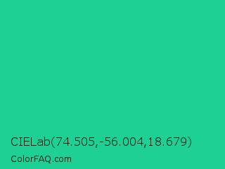 CIELab 74.505,-56.004,18.679 Color is a normal green color and the nearest color is Shamrock #33cc99. Hex code #1ed093 and RGB value is rgb(30,208,147). In RGB color space, this color is composed of 12% red, 82% green, 58% blue, In CMYK color space, this color is composed of 86% cyan, 0% magenta, 29% yellow , 18% black , In HSL color space, this color has a hue angle of 159° , 75% saturation and 47% lightness.