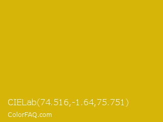 CIELab 74.516,-1.64,75.751 Color is a normal yellow color and the nearest color is Galliano #dcb20c. Hex code #d7b508 and RGB value is rgb(215,181,8). In RGB color space, this color is composed of 84% red, 71% green, 3% blue, In CMYK color space, this color is composed of 0% cyan, 16% magenta, 96% yellow , 16% black , In HSL color space, this color has a hue angle of 50° , 93% saturation and 44% lightness.