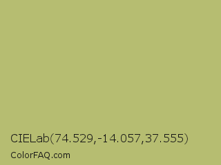 CIELab 74.529,-14.057,37.555 Color is a normal yellow color and the nearest color is Wild Willow #b9c46a. Hex code #b6bd71 and RGB value is rgb(182,189,113). In RGB color space, this color is composed of 71% red, 74% green, 44% blue, In CMYK color space, this color is composed of 4% cyan, 0% magenta, 40% yellow , 26% black , In HSL color space, this color has a hue angle of 66° , 37% saturation and 59% lightness.