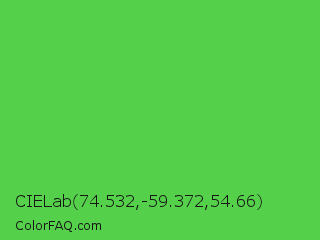 CIELab 74.532,-59.372,54.66 Color is a normal green color and the nearest color is Apple #4fa83d. Hex code #55d04a and RGB value is rgb(85,208,74). In RGB color space, this color is composed of 33% red, 82% green, 29% blue, In CMYK color space, this color is composed of 59% cyan, 0% magenta, 64% yellow , 18% black , In HSL color space, this color has a hue angle of 115° , 59% saturation and 55% lightness.