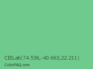CIELab 74.536,-40.663,22.211 Color is a light green color and the nearest color is De York #7ac488. Hex code #6fca8d and RGB value is rgb(111,202,141). In RGB color space, this color is composed of 44% red, 79% green, 55% blue, In CMYK color space, this color is composed of 45% cyan, 0% magenta, 30% yellow , 21% black , In HSL color space, this color has a hue angle of 140° , 46% saturation and 61% lightness.