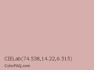 CIELab 74.538,14.22,6.515 Color is a light red color and the nearest color is Pale Chestnut #ddadaf. Hex code #d6aeac and RGB value is rgb(214,174,172). In RGB color space, this color is composed of 84% red, 68% green, 67% blue, In CMYK color space, this color is composed of 0% cyan, 19% magenta, 20% yellow , 16% black , In HSL color space, this color has a hue angle of 3° , 34% saturation and 76% lightness.