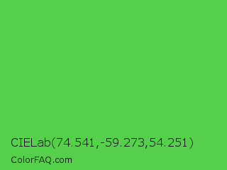 CIELab 74.541,-59.273,54.251 Color is a normal green color and the nearest color is Mantis #74c365. Hex code #55d04b and RGB value is rgb(85,208,75). In RGB color space, this color is composed of 33% red, 82% green, 29% blue, In CMYK color space, this color is composed of 59% cyan, 0% magenta, 64% yellow , 18% black , In HSL color space, this color has a hue angle of 115° , 59% saturation and 55% lightness.