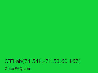 CIELab 74.541,-71.53,60.167 Color is a normal green color and the nearest color is Vivid Malachite #00cc33. Hex code #14d43b and RGB value is rgb(20,212,59). In RGB color space, this color is composed of 8% red, 83% green, 23% blue, In CMYK color space, this color is composed of 91% cyan, 0% magenta, 72% yellow , 17% black , In HSL color space, this color has a hue angle of 132° , 83% saturation and 45% lightness.