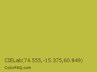 CIELab 74.555,-15.375,60.849 Color is a normal yellow color and the nearest color is Earls Green #c9b93b. Hex code #bdbd3f and RGB value is rgb(189,189,63). In RGB color space, this color is composed of 74% red, 74% green, 25% blue, In CMYK color space, this color is composed of 0% cyan, 0% magenta, 67% yellow , 26% black , In HSL color space, this color has a hue angle of 60° , 50% saturation and 49% lightness.