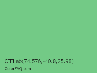 CIELab 74.576,-40.8,25.98 Color is a light green color and the nearest color is De York #7ac488. Hex code #73ca86 and RGB value is rgb(115,202,134). In RGB color space, this color is composed of 45% red, 79% green, 53% blue, In CMYK color space, this color is composed of 43% cyan, 0% magenta, 34% yellow , 21% black , In HSL color space, this color has a hue angle of 133° , 45% saturation and 62% lightness.