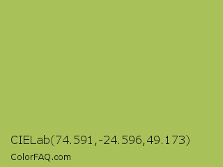 CIELab 74.591,-24.596,49.173 Color is a normal lime color and the nearest color is Middle Green Yellow #acbf60. Hex code #a8c259 and RGB value is rgb(168,194,89). In RGB color space, this color is composed of 66% red, 76% green, 35% blue, In CMYK color space, this color is composed of 13% cyan, 0% magenta, 54% yellow , 24% black , In HSL color space, this color has a hue angle of 75° , 46% saturation and 55% lightness.