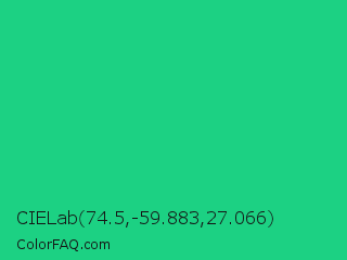 CIELab 74.5,-59.883,27.066 Color is a normal green color and the nearest color is Mountain Meadow Crayola #1ab385. Hex code #1cd183 and RGB value is rgb(28,209,131). In RGB color space, this color is composed of 11% red, 82% green, 51% blue, In CMYK color space, this color is composed of 87% cyan, 0% magenta, 37% yellow , 18% black , In HSL color space, this color has a hue angle of 154° , 76% saturation and 46% lightness.