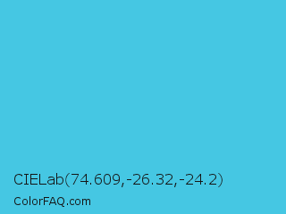 CIELab 74.609,-26.32,-24.2 Color is a normal cyan color and the nearest color is Sea Serpent #4bc7cf. Hex code #45c7e3 and RGB value is rgb(69,199,227). In RGB color space, this color is composed of 27% red, 78% green, 89% blue, In CMYK color space, this color is composed of 70% cyan, 12% magenta, 0% yellow , 11% black , In HSL color space, this color has a hue angle of 191° , 74% saturation and 58% lightness.