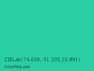 CIELab 74.639,-51.205,10.891 Color is a normal cyan color and the nearest color is Shamrock #33cc99. Hex code #29cfa2 and RGB value is rgb(41,207,162). In RGB color space, this color is composed of 16% red, 81% green, 64% blue, In CMYK color space, this color is composed of 80% cyan, 0% magenta, 22% yellow , 19% black , In HSL color space, this color has a hue angle of 164° , 67% saturation and 49% lightness.