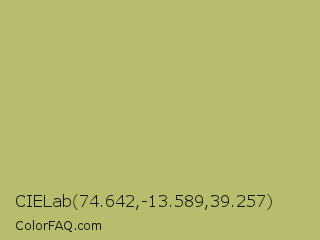CIELab 74.642,-13.589,39.257 Color is a normal yellow color and the nearest color is Wild Willow #b9c46a. Hex code #b8bd6e and RGB value is rgb(184,189,110). In RGB color space, this color is composed of 72% red, 74% green, 43% blue, In CMYK color space, this color is composed of 3% cyan, 0% magenta, 42% yellow , 26% black , In HSL color space, this color has a hue angle of 64° , 37% saturation and 59% lightness.