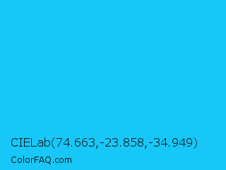 CIELab 74.663,-23.858,-34.949 Color is a normal cyan color and the nearest color is Spiro Disco Ball #0fc0fc. Hex code #17c7f7 and RGB value is rgb(23,199,247). In RGB color space, this color is composed of 9% red, 78% green, 97% blue, In CMYK color space, this color is composed of 91% cyan, 19% magenta, 0% yellow , 3% black , In HSL color space, this color has a hue angle of 193° , 93% saturation and 53% lightness.