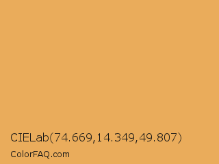 CIELab 74.669,14.349,49.807 Color is a light orange color and the nearest color is Sunray #e3ab57. Hex code #eaac5b and RGB value is rgb(234,172,91). In RGB color space, this color is composed of 92% red, 67% green, 36% blue, In CMYK color space, this color is composed of 0% cyan, 26% magenta, 61% yellow , 8% black , In HSL color space, this color has a hue angle of 34° , 77% saturation and 64% lightness.