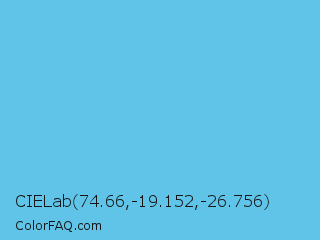 CIELab 74.66,-19.152,-26.756 Color is a light blue color and the nearest color is Viking #64ccdb. Hex code #5fc4e8 and RGB value is rgb(95,196,232). In RGB color space, this color is composed of 37% red, 77% green, 91% blue, In CMYK color space, this color is composed of 59% cyan, 16% magenta, 0% yellow , 9% black , In HSL color space, this color has a hue angle of 196° , 75% saturation and 64% lightness.