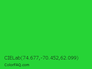 CIELab 74.677,-70.452,62.099 Color is a normal green color and the nearest color is Lime Green #32cd32. Hex code #26d436 and RGB value is rgb(38,212,54). In RGB color space, this color is composed of 15% red, 83% green, 21% blue, In CMYK color space, this color is composed of 82% cyan, 0% magenta, 75% yellow , 17% black , In HSL color space, this color has a hue angle of 126° , 70% saturation and 49% lightness.