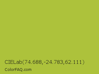 CIELab 74.688,-24.783,62.111 Color is a normal yellow color and the nearest color is Android Green #a4c639. Hex code #adc23b and RGB value is rgb(173,194,59). In RGB color space, this color is composed of 68% red, 76% green, 23% blue, In CMYK color space, this color is composed of 11% cyan, 0% magenta, 70% yellow , 24% black , In HSL color space, this color has a hue angle of 69° , 53% saturation and 50% lightness.