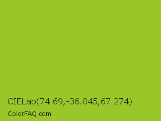CIELab 74.69,-36.045,67.274 Color is a normal lime color and the nearest color is Atlantis #97cd2d. Hex code #99c72a and RGB value is rgb(153,199,42). In RGB color space, this color is composed of 60% red, 78% green, 16% blue, In CMYK color space, this color is composed of 23% cyan, 0% magenta, 79% yellow , 22% black , In HSL color space, this color has a hue angle of 78° , 65% saturation and 47% lightness.