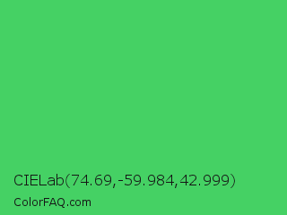CIELab 74.69,-59.984,42.999 Color is a normal green color and the nearest color is UFO Green #3cd070. Hex code #45d164 and RGB value is rgb(69,209,100). In RGB color space, this color is composed of 27% red, 82% green, 39% blue, In CMYK color space, this color is composed of 67% cyan, 0% magenta, 52% yellow , 18% black , In HSL color space, this color has a hue angle of 133° , 60% saturation and 55% lightness.