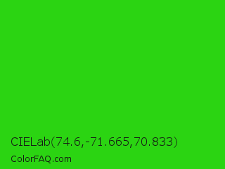 CIELab 74.6,-71.665,70.833 Color is a normal green color and the nearest color is Harlequin Green #46cb18. Hex code #2bd412 and RGB value is rgb(43,212,18). In RGB color space, this color is composed of 17% red, 83% green, 7% blue, In CMYK color space, this color is composed of 80% cyan, 0% magenta, 92% yellow , 17% black , In HSL color space, this color has a hue angle of 112° , 84% saturation and 45% lightness.