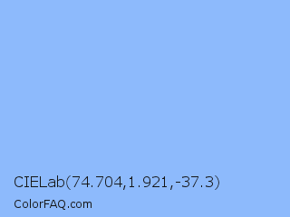 CIELab 74.704,1.921,-37.3 Color is a light blue color and the nearest color is Jordy Blue #8ab9f1. Hex code #8dbafc and RGB value is rgb(141,186,252). In RGB color space, this color is composed of 55% red, 73% green, 99% blue, In CMYK color space, this color is composed of 44% cyan, 26% magenta, 0% yellow , 1% black , In HSL color space, this color has a hue angle of 216° , 95% saturation and 77% lightness.
