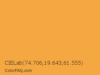 CIELab 74.706,19.643,61.555 Color is a light orange color and the nearest color is Neon Carrot #ffa343. Hex code #f5a842 and RGB value is rgb(245,168,66). In RGB color space, this color is composed of 96% red, 66% green, 26% blue, In CMYK color space, this color is composed of 0% cyan, 31% magenta, 73% yellow , 4% black , In HSL color space, this color has a hue angle of 34° , 90% saturation and 61% lightness.