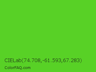 CIELab 74.708,-61.593,67.283 Color is a normal green color and the nearest color is Harlequin Green #46cb18. Hex code #58d126 and RGB value is rgb(88,209,38). In RGB color space, this color is composed of 35% red, 82% green, 15% blue, In CMYK color space, this color is composed of 58% cyan, 0% magenta, 82% yellow , 18% black , In HSL color space, this color has a hue angle of 102° , 69% saturation and 48% lightness.