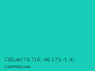 CIELab 74.716,-46.173,-1.4 Color is a normal cyan color and the nearest color is Java #1fc2c2. Hex code #17ceb9 and RGB value is rgb(23,206,185). In RGB color space, this color is composed of 9% red, 81% green, 73% blue, In CMYK color space, this color is composed of 89% cyan, 0% magenta, 10% yellow , 19% black , In HSL color space, this color has a hue angle of 173° , 80% saturation and 45% lightness.
