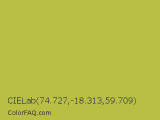 CIELab 74.727,-18.313,59.709 Color is a normal yellow color and the nearest color is Earls Green #c9b93b. Hex code #b8bf42 and RGB value is rgb(184,191,66). In RGB color space, this color is composed of 72% red, 75% green, 26% blue, In CMYK color space, this color is composed of 4% cyan, 0% magenta, 65% yellow , 25% black , In HSL color space, this color has a hue angle of 63° , 49% saturation and 50% lightness.