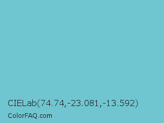 CIELab 74.74,-23.081,-13.592 Color is a light cyan color and the nearest color is Downy #6fd0c5. Hex code #6fc5d0 and RGB value is rgb(111,197,208). In RGB color space, this color is composed of 44% red, 77% green, 82% blue, In CMYK color space, this color is composed of 47% cyan, 5% magenta, 0% yellow , 18% black , In HSL color space, this color has a hue angle of 187° , 51% saturation and 63% lightness.