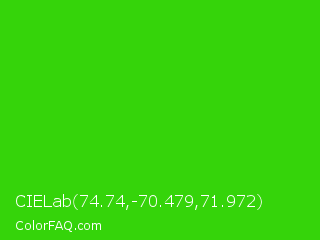 CIELab 74.74,-70.479,71.972 Color is a normal green color and the nearest color is Harlequin Green #46cb18. Hex code #35d40a and RGB value is rgb(53,212,10). In RGB color space, this color is composed of 21% red, 83% green, 4% blue, In CMYK color space, this color is composed of 75% cyan, 0% magenta, 95% yellow , 17% black , In HSL color space, this color has a hue angle of 107° , 91% saturation and 44% lightness.