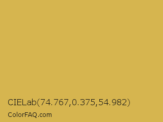 CIELab 74.767,0.375,54.982 Color is a normal orange color and the nearest color is Anzac #e0b646. Hex code #d6b54f and RGB value is rgb(214,181,79). In RGB color space, this color is composed of 84% red, 71% green, 31% blue, In CMYK color space, this color is composed of 0% cyan, 15% magenta, 63% yellow , 16% black , In HSL color space, this color has a hue angle of 45° , 62% saturation and 57% lightness.