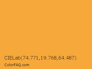 CIELab 74.771,19.768,64.487 Color is a normal orange color and the nearest color is Yellow Orange #ffae42. Hex code #f6a83b and RGB value is rgb(246,168,59). In RGB color space, this color is composed of 96% red, 66% green, 23% blue, In CMYK color space, this color is composed of 0% cyan, 32% magenta, 76% yellow , 4% black , In HSL color space, this color has a hue angle of 35° , 91% saturation and 60% lightness.